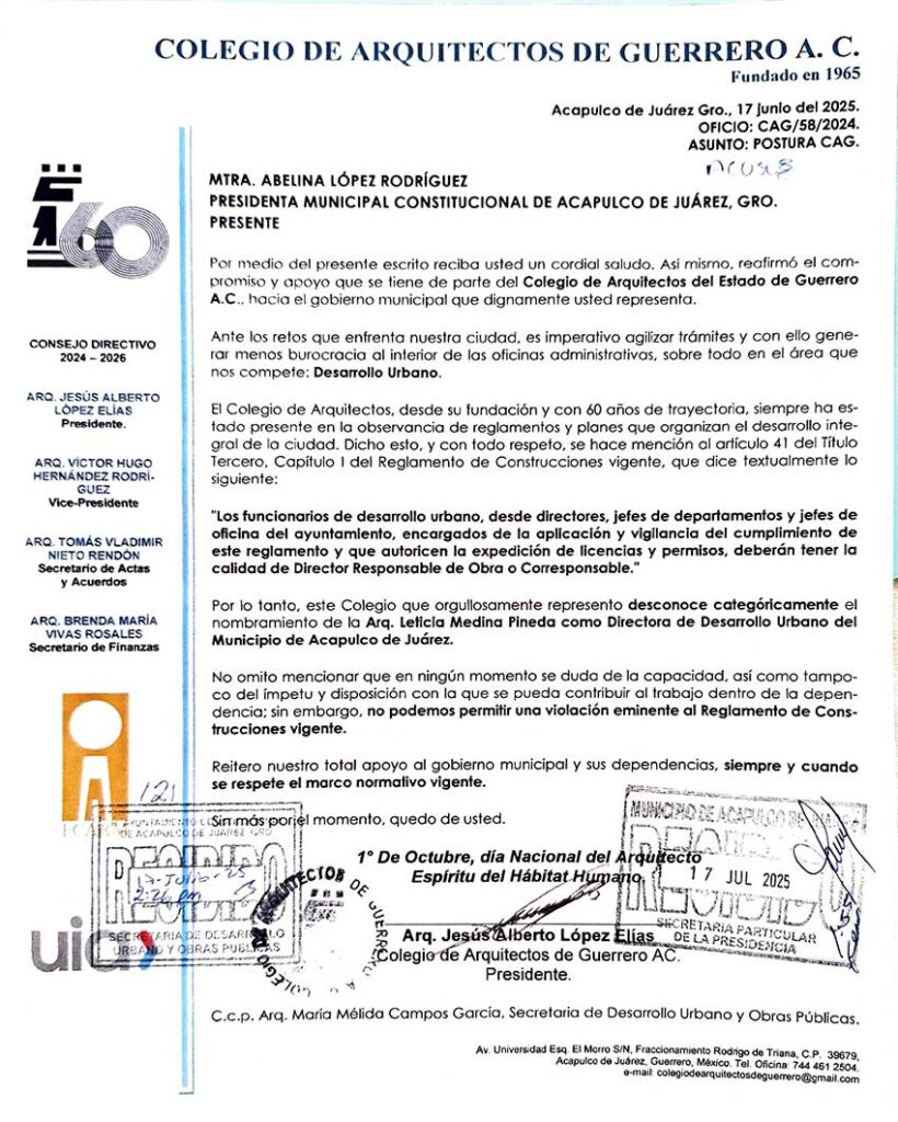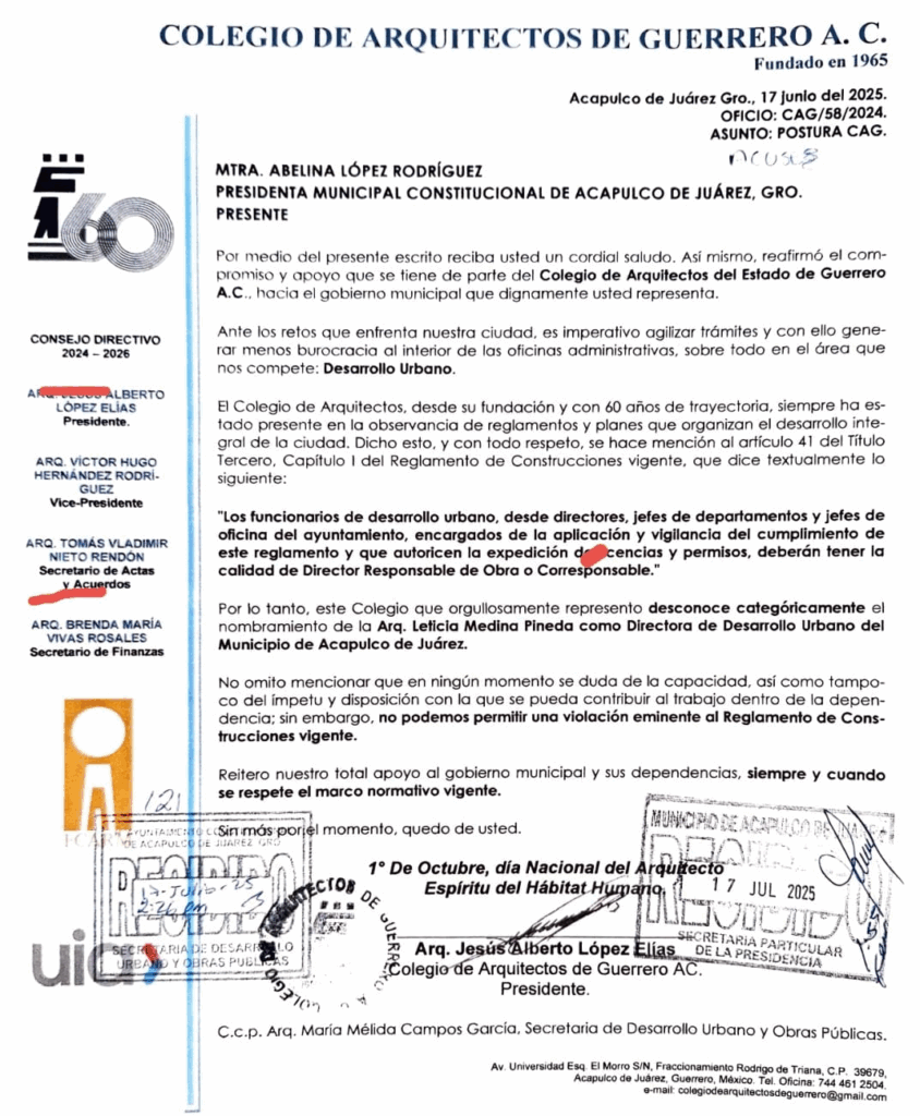 Los Colegio de profesionales de la construcción denunciaron a la Maestra Abelina López Rodríguez las violaciones al Art. 41 del reglamento de construcciones con oficios entregados en las oficinas de la presidencia, donde solicitan respetar las disposiciones de los artículos violentado por la Arq. Mélida Campos.