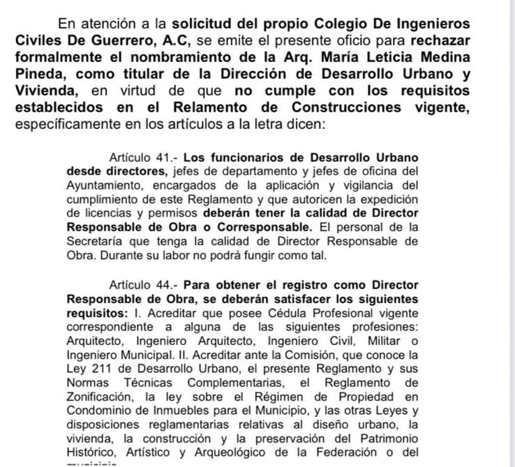 Cabe hacer mención que la Arq. María Leticia Medina Pineda cuenta con un carnet de DRO expedido por la SDUOP la cual no es reconocida en Acapulco por lo cual debe cumplir con este requisito, tomando un curso y obtener su carnet como Director Responsable de Obra avalada por la CADROC.